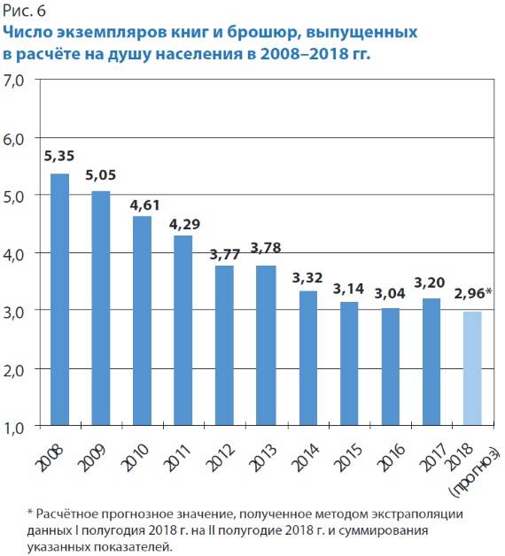 Что касается количества экземпляров книг и брошюр, выпущенных в расчёте на душу населения, то по итогам первого полугодия, как известно, ещё нельзя в полной мере судить о том, какова будет общая картина по результатам всего года. Однако если экстраполировать значение этого показателя на второе полугодие и полученные данные сложить (т.е. просто удвоить значение первого полугодия), то можно с сожалением прогнозировать, что данный показатель рискует стать едва ли не худшим не только за последние 11 лет, но и за всю постсоветскую историю отечественного книгоиздания: 2,96 экз. книг и брошюр на душу населения. По сравнению с 2017 г. этот показатель снизился на 7,5%, а по отношению к пиковому 2008-му — уже на 44,7% (рис. 6).