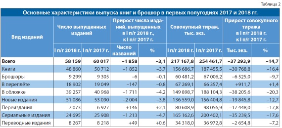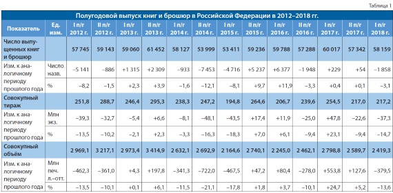 Согласно данным Российской книжной палаты (филиала ФГУП «ИТАР-ТАСС»), в первом полугодии 2018 г. в России было выпущено 58 159 названий книг и брошюр совокупным тиражом 217,2 млн экз. В сравнении с аналогичным периодом прошлого года число выпущенных названий сократилось на 3,1%, а совокупный тираж упал почти на 15% (табл. 1). Совокупный листаж выпущенной издательской продукции по итогам I полугодия 2018 г. составил 2419,3 млн печ. л.-отт., что почти на 14% меньше, чем за аналогичный период 2017-го.