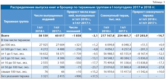 Детализацию общего выпуска книг и брошюр в первом полугодии 2018 г. хорошо раскрывает сравнение выпуска изданий по тиражным группам (табл. 3).