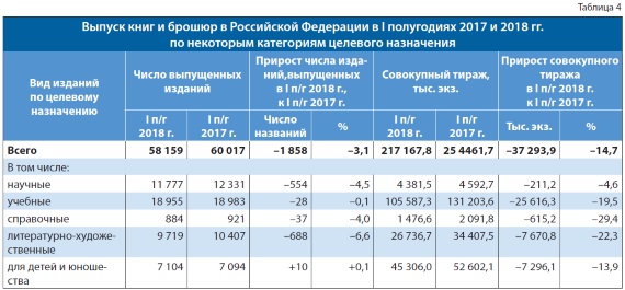 Динамику выпуска основных видов литературы в первом полугодии 2018 г. характеризуют данные табл. 4.