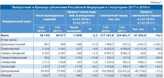 Наибольшее падение как по числу выпущенных названий, так и по тиражу в I полугодии 2018 г. произошло в Южном федеральном округе (–19,5% по числу выпущенных названий и –27% по тиражу).