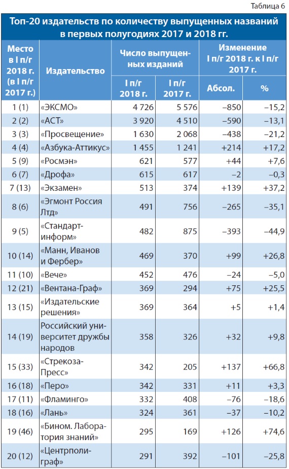 По числу выпущенных названий его возглавляют два многолетних лидера, объединённых в одну издательскую группу, но результаты которых мы по традиции, с тех времён, когда эти издательства были ещё самостоятельными, считаем раздельно. Итак, на первом месте — издательство «ЭКСМО», выпустившее за рассматриваемый период 4726 названий книг и брошюр, что на 15,2% меньше, чем за первую половину прошлого года (5576 названий). Второе место занимает издательство «АСТ», которое выпустило в I полугодии 2018 г. 3920 названий книг и брошюр, что на 13,1% меньше, чем за аналогичный период 2017-го (4510 названий). К сожалению, оба лидера по числу выпущенных названий в прошедшем полугодии показали снижение, которое, видимо, отразилось и на общем результате деятельности отечественной издательской индустрии.