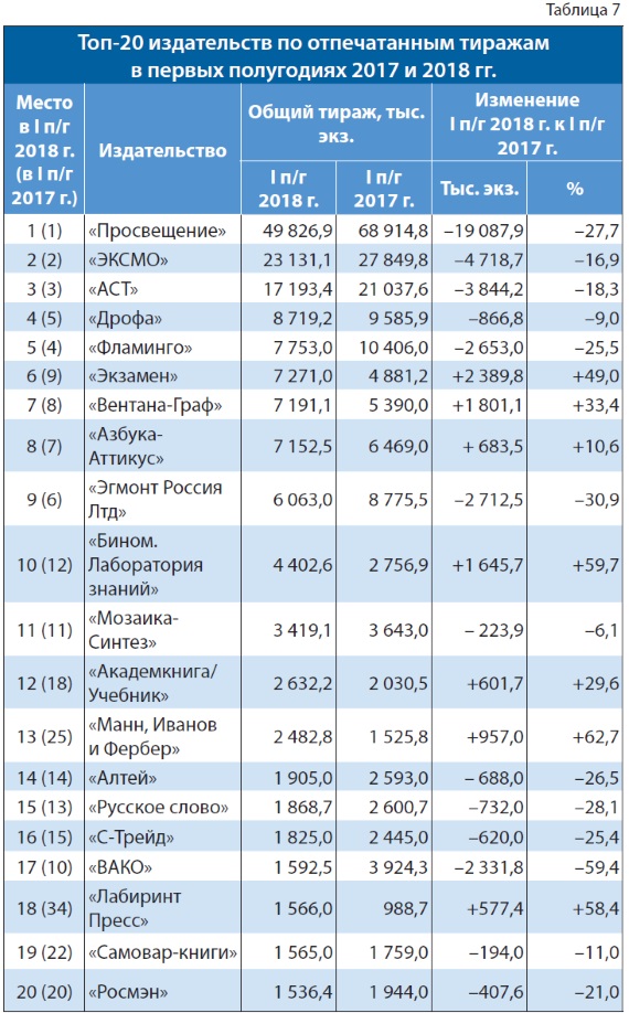 Что касается рейтинга издательств по отпечатанным ими тиражам (табл. 7), то лидирует по итогам I полугодия 2018 г. издательство «Просвещение», выпустившее 49 826,9 тыс. экз. К сожалению, здесь тоже по отношению к аналогичному периоду прошлого года наблюдается снижение, причём довольно существенное и тоже, безусловно, сказавшееся на общей картине первой половины 2018 г.: сразу на 27,7%.