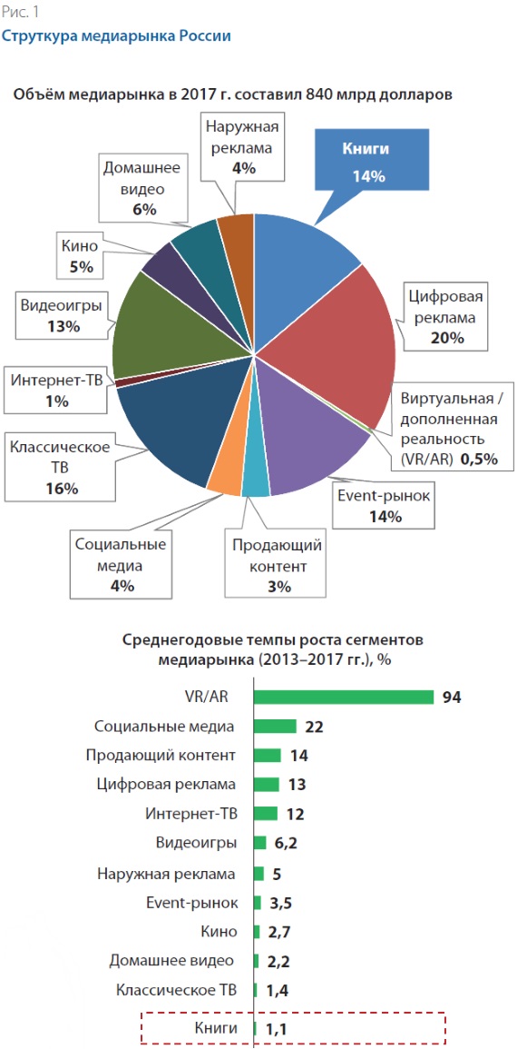 По мнению Президента издательской группы «ЭКСМО-АСТ», члена Президиума РКС Олега НОВИКОВА, книги занимают значимую долю медиарынка (14%), но катастрофически отстают от новых цифровых сегментов по темпам роста (рис. 1).
