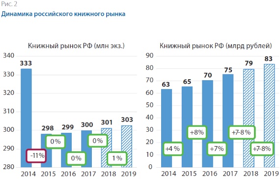 В натуральном выражении российский книжный рынок демонстрирует достаточно низкую динамику: в 2018 г., по самым позитивным прогнозам, увеличение в денежном измерении ожидается на уровне в 7–8%, такой же рост прогнозируется и в 2019-м (рис. 2).