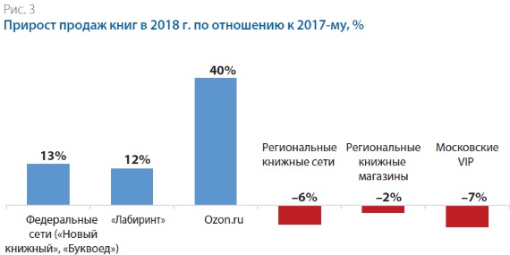 По оценке Президента «ЭКСМО-АСТ», российский книжный рынок ощутимо переходит в онлайн, а федеральные сети растут только за счёт открытия новых магазинов (рис. 3). Интернет-магазины продемонстрировали за год увеличение объёма продаж на 18% (с 12,8 до 15,1 млрд рублей), сетевые магазины — на 13% (с 10,8 до 12,2 млрд). Продажи в независимых книжных упали с 28,2 до 26,8 млрд рублей (на 5%).