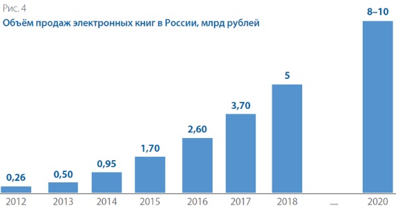 По оценке Генерального директора компании «ЛитРес» Сергея АНУРЬЕВА, объём рынка электронной книги в России по итогам 2018 г. составит 4,8–5,2 млрд рублей, или около 8–9% от ёмкости коммерческого книжного рынка (рис. 4).