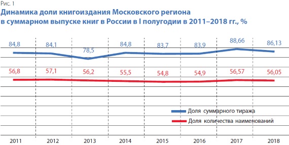 Согласно данным государственной статистики, по состоянию на I полугодие 2018 г. Москва остаётся центром книгоиздания Российской Федерации. Именно здесь выходит в свет 56,1% книжных титулов, а доля московских импринтов в суммарном тираже составляет 86,1%, что во многом объясняется размещением в столице ведущих российских издательских структур, ориентированных на выпуск массовой книжной продукции и учебных изданий для общеобразовательной школы (рис. 1).
