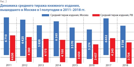 Средний тираж издания с московским импринтом в I полугодии 2018 г. составил 5738 экз. при среднеотраслевом показателе в 3734 экз. (рис. 2). Таким образом, в сравнении с первой половиной 2017-го столичный средний тираж, как и общеотраслевой, сократился фактически на 12–13%.