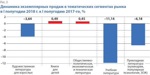 По данным Российской книжной палаты, в I полугодии 2018 г. наибольшее снижение издательских инвестиций зафиксировано в сегменте литературно-художественной книги для взрослых. На фоне первой половины 2017-го потери составили 700 наименований, или 7,7 млн экз. Учебная и детская книги пока сохраняют объём выпуска, по крайней мере в плане количества наименований (18,9 и 7,1 тыс. соответственно) при параллельном сокращении среднего тиража издания (–14...19%). В наибольшей степени сокращение выпуска произошло в группах изданий технической и художественной литературы. Относительно стабильна ситуация лишь в небольших по объёму разделах медицинской и сельскохозяйственной литературы.