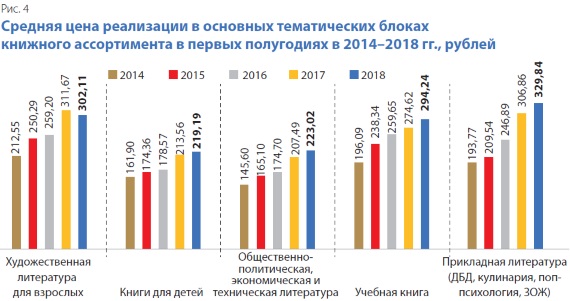 В сравнении первых полугодий 2017 и 2018 гг. максимальное снижение средней цены покупки зафиксировано лишь в сегменте художественной литературы для взрослых. Наибольший рост средней цены реализации зафиксирован в сегменте non-fiction (экономической и прикладной) литературы — более 7%; наименьший (+2,6%) — в детской книге (рис. 4).