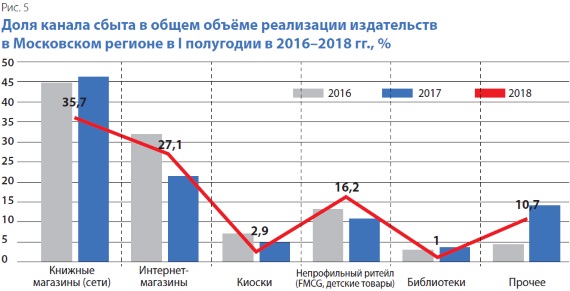 Следует также отметить и плотное сотрудничество с интернет-магазинами. В 2018 г. пропускная способность этого канала в Московском регионе находилась на уровне 27,1% от суммарной реализации столичных издательств (в 2017-м — 22%; в 2016-м — 31,9%; в 2015-м — 17,67%; в 2014-м — 10,87%; в 2013-м — 18,7%; в 2012-м — 11,2%). Ведущими партнёрами издательств являются Ozon.ru, Labirint.ru, My-shop.ru, Wildberries.ru и др. Значительна доля онлайн-партнёров и у издателей, специализирующихся на выпуске учебных и учебно-методических изданий для общеобразовательной школы: «Просвещения», «Дрофы», «Вентаны-Граф» и др. Хотя в целом структура их реализации в столичном регионе в значительной степени (до 70%) ориентирована на Департамент образования Правительства Москвы как организатора аукционов по закупкам учебников, а также на собственные онлайн-сервисы (BOOK24.ru, LECTA и PROSV.ru).