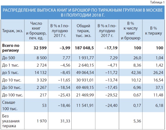 В 2018 г. столичный книжный выпуск рос преимущественно за счёт малотиражных изданий (табл. 1). В группе книг и брошюр, выпущенных тиражом 500 — 1000 экз., число наименований в первой половине 2018 г. выросло на 4,5% в сравнении с I полугодием 2017-го, в то время как в других тиражных группах речь идёт исключительно об отрицательной динамике в диапазоне 9–25%.