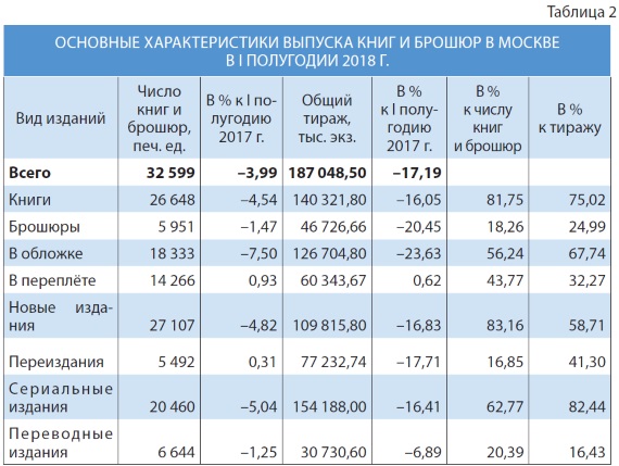 Как показывает анализ табл. 1, в первой половине 2018 г. суммарный выпуск в столице сократился на 3,99% по количеству наименований и на 17,2% по суммарному тиражу в сравнении с тем же периодом 2017-го. Наиболее очевидна отрицательная динамика в плане новинок: в 2018-м их число сократилось на 4,8%, а тираж — на 17%.