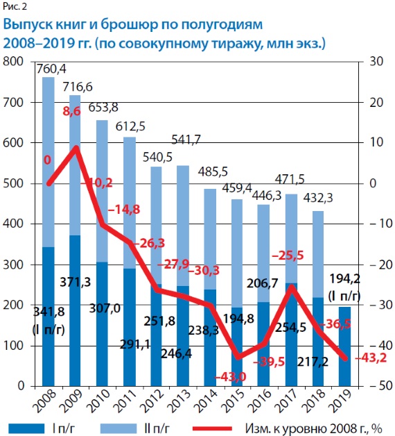 Если предположить, что во втором полугодии 2019 г. отечественная издательская отрасль будет функционировать так же, как и в первом, то по результатам полного года есть риск увидеть довольно заметное снижение книжного выпуска по отношению к уровню не только 2018 г., но и всего предшествующего десятилетия: в стране может быть выпущено лишь около 110 тыс. названий книг и брошюр (приблизительно –6% к уровню 2018 г.), отпечатанных тиражом 390–400 млн экз. (примерно –8,5% к уровню 2018 г.), совокупный печатный объём которых составит примерно 4650 млн печ. л.-отт. (около –4,5% к уровню 2018 г.). А это означает, что сейчас мы фактически стоим на краю «обрыва», в шаге от новых минимумов десятилетия, причём одновременно по всем трём позициям: числу названий, тиражу и листажу, а не только по тиражу и листажу, как бывало прежде.