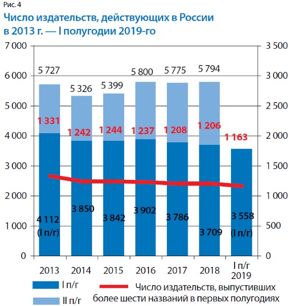 В I полугодии 2019 г., по данным Российской книжной палаты, в стране была зарегистрирована деятельность 3558 издательств, что на 4,1% меньше, чем за аналогичный период 2018-го (3709 издательств). Число активно действующих издательств, к которым мы традиционно относим издающие организации, выпускающие в среднем не менее одной книги в месяц (т.е. выпустивших в I полугодии 2019-го не менее шести названий книг и брошюр), составило 1163. По отношению к I полугодию 2018 г. (1206 издательств) число активно действующих издательств тоже сократилось — на 3,6% (рис. 4).