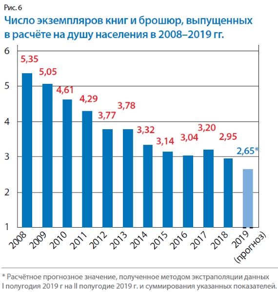 Что касается числа экземпляров книг и брошюр, выпущенных в расчёте на душу населения, то по итогам одного полугодия, конечно же, ещё нельзя в полной мере судить, какой будет общая картина по году. Однако если экстраполировать значение этого показателя, достигнутое в первом полугодии, на второе и полученные данные сложить, то можно с сожалением прогнозировать, что данный показатель рискует стать едва ли не худшим не только за последние 12 лет, но и за всю постсоветскую историю отечественного книгоиздания: 2,65 экз. книг и брошюр на душу населения. По сравнению с 2018 г. этот показатель снизился на 10,2%, а по сравнению с пиковым 2008-м — ровно вдвое (рис. 6).