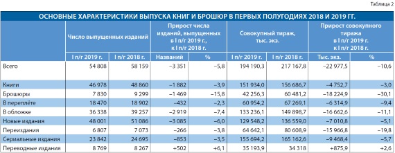 Немаловажным показателем оценки развития книгоиздания является соотношение выпуска новых книг и переизданий. Как видно из табл. 2, по итогам I полугодия 2019 г. число выпущенных названий новых изданий в сравнении с аналогичным периодом прошлого года сократилось сразу на 6%, а по тиражу — на 5,1%. Число переизданий по количеству выпущенных названий упало на 3,8%, а по тиражу — на 19,8%.