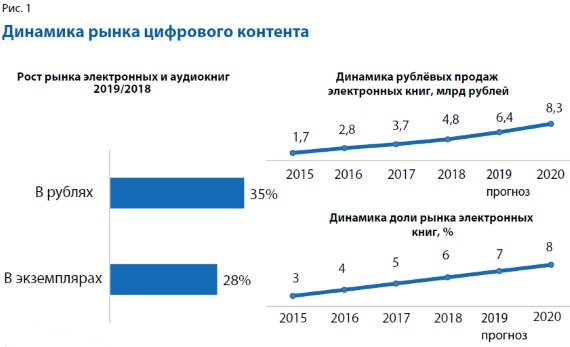 Конечно, не все издательства, розничные магазины и направления так активно развиваются. Тем не менее сегмент электронной книги за этот год вырос на 35%. При такой динамике доля рынка э-книг может составить 7–8% уже в этом году (рис.1). А с учётом того, что аудиокниги развиваются ещё более динамично при низкой базе, на этом рост не остановится, уверен эксперт.