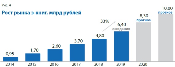 По оценке Генерального директора компании «ЛитРес» Сергея АНУРЬЕВА, рынок э-книг в 2019 г. вырастет на 33%, достигнет объёма в 6,4 млрд рублей и затем продолжит увеличение на 1,5–2 млрд рублей в год. К 2021 г. его доля может превысить 15% (рис. 4).