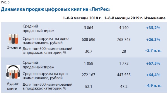 В «ЛитРес» совокупный тираж э-книг за восемь месяцев 2019 г. вырос на 42%, тираж аудиокниг — на 86%. Средний тираж наименований текстовых э-книг, входящих в топ-100, увеличивается на 35%, выручка растёт на 26%. В аудиокнигах рост существенно выше — практически в два раза (рис. 5).