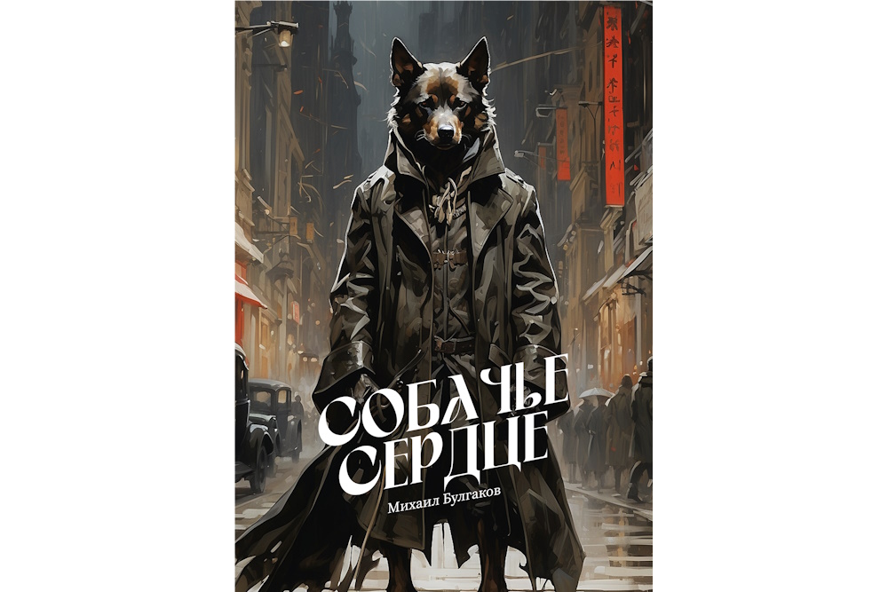 Нейросеть предложила несколько сюжетов для оформления альтернативной обложки «Собачьего сердца», на основе которых Кир Витковский — основатель, идеолог и СЕО онлайн-сервиса автоматической вёрстки печатных и электронных изданий «Метранпаж» — сформулировал запрос на русском языке, уместившийся всего в одно предложение. «Злая и агрессивная антропоморфная собака в кожаном плаще, стоящая на фоне динамичной улицы 1925 года», — таким был представлен образ, заданный нейросети и воплощённый в оригинальной обложке с элементами постапокалипсиса в китайском квартале.