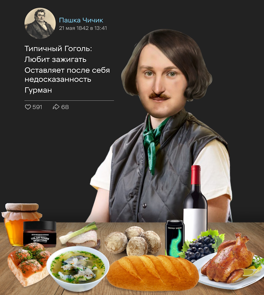 Типичный персонаж Николая Гоголя — это представитель своего времени, наделенный характерными пороками общества от чревоугодия до расточительства. Продуктовая корзина, собранная на основе проанализированных семи произведений автора, полностью соответствует этому образу — это самая дорогая корзина, которая обойдется примерно в 4014 руб. В нее вошли как типичные продукты из рейтинга, например, хлеб, вино, мясо, курица, так и характерные только для творчества Гоголя — саламата (мучная каша или кисель), сало, пышки и уха.