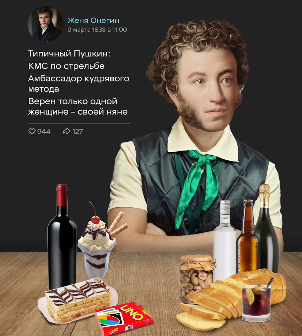 Примерно в 2340 рублей обойдется корзина героя Александра Пушкина. Уставший от жизни типичный персонаж Пушкина запивает свою скуку вином, водкой, шампанским, пивом, ромом и лимонадом. Закуска для этого небогатая — хлеб, маринованные грибы, пирожные и мороженое — но отвечает духу произведений.
