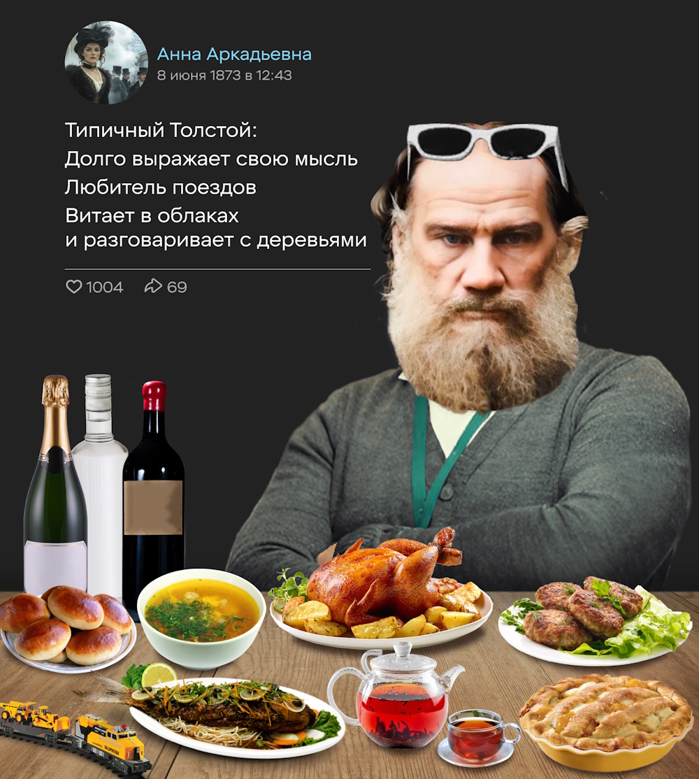 Больше всего упоминаний алкоголя в произведениях у Льва Толстого — вино, водка и шампанское занимают первые строчки среди всех продуктов в большинстве произведений писателя. Типичная корзина героя Толстого — любителя выпить, чтобы отпраздновать победу над Наполеоном, — будет стоить около 2630 руб. При этом из существенных блюд высокое место в рационе героя занимают курица, рыба и пироги.