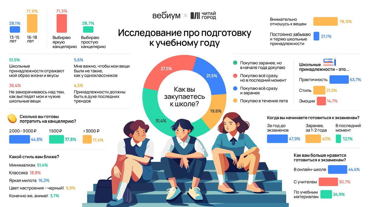 С приближением нового учебного года родители и школьники вновь сталкиваются с вопросом подготовки. Опрос, проведенный онлайн-школой для подготовки к ЕГЭ и ОГЭ “Вебиум” и сетью книжных магазинов "Читай-город", выявил, как изменились предпочтения подростков при выборе школьных принадлежностей и подходе к учебе. В опросе приняли участие 1055 учеников от 13 до 18 лет.