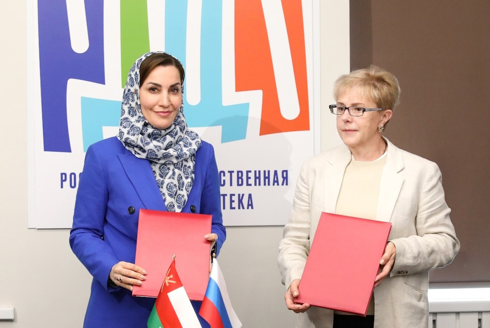 Директор Российской государственной детской библиотеки Мария Веденяпина и Её Высочество принцесса Омана, заместитель вице-канцлера Университета Султана Кабуса, почетный президент Детской публичной библиотеки Султаната Оман доктор Муна бинт Фахад бин Махмуд Аль-Саид подписали Соглашение о сотрудничестве между библиотеками.
