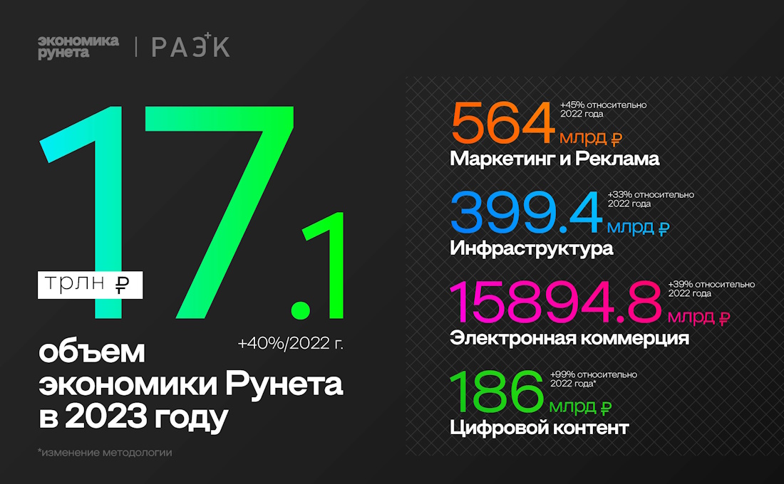 Главный вывод: Рунет вырос в 2023 году на 40% по отношению к 2022 году. Вклад интернет-экономики в экономику России в 2023 году составил 17,1 трлн рублей.