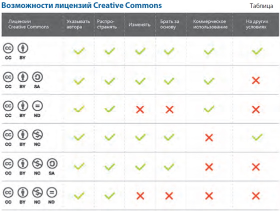 Для создания курсов интересна система Discovery, поскольку содержит много ресурсов свободного доступа, отметил В. Прудников. Однако эксперт предостерёг преподавателей от стремления разместить в онлайн-курсе тексты таких ресурсов: это также будет нарушением авторского права, за несколькими исключениями. В ряде ресурсов статьи сопровождаются определёнными значками лицензии Creative Commons. Если указано CC BY, то такой контент можно распространять совершенно свободно и вставлять в свои курсы с обязательным указанием автора. Если стоит маркер ND, такую статью нельзя изменять или брать за основу собственной работы. Это же относится к монографиям, учебникам, фото и другим иллюстрациям. Разобраться в ситуации поможет информация, представленная в таблице.