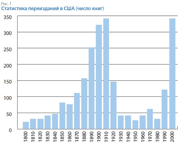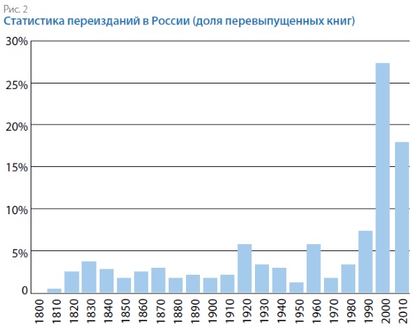 В России статистика выглядит ещё более удручающей: книги, опубликованные до XXI в., практически не переиздаются (рис. 2). Приведённый график — результат исследования, проведённого В.В. Харитоновым в 2016 г. для книги «Информационная сверхпроводимость: авторское право как инструмент развития»⁶.