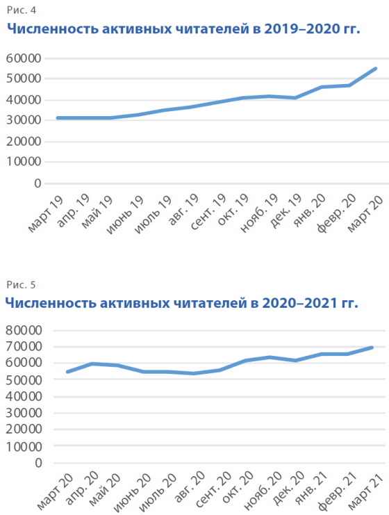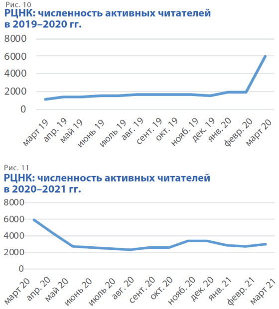 Число активных читателей также значительно увеличилось: в марте и апреле 2020 г. таких среди пользователей РЦНК было свыше 16 тыс., в то время как в эти же месяцы 2019-го их было более чем в три раза меньше (рис. 10 и 11).
