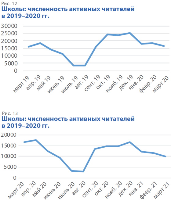 Статистика по проекту «ЛитРес: Школа» значительно различается. Активнее всего в 2020 г. школьники запрашивали книги с октября по январь, как раз во время первого учебного полугодия, а также в преддверии осенних и зимних каникул. В период карантина показатели читательской активности практически не отличались от аналогичных во время осенних и новогодних каникул (рис. 12 и 13).