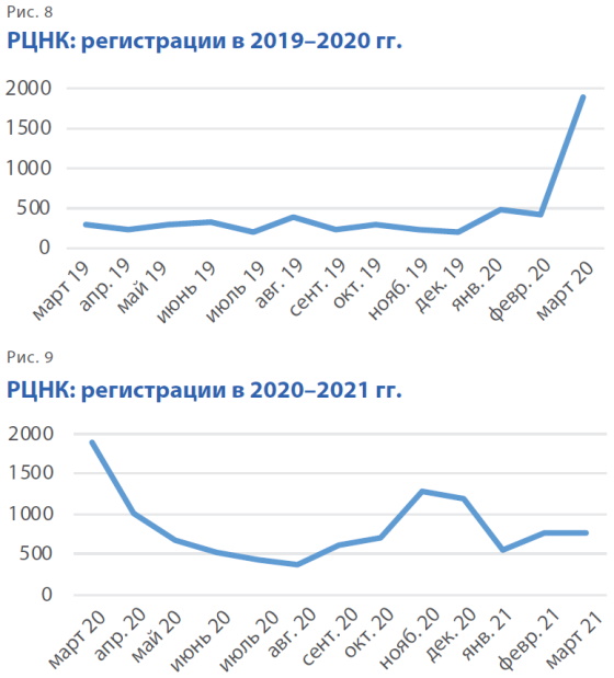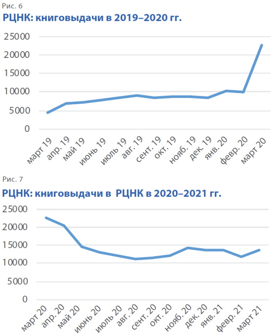 В российских научных и культурных центрах (РЦНК) за рубежом спрос на электронные и аудиокниги в период карантина также значительно увеличился. Пик книговыдач пришелся на март и апрель 2020 г. Максимальный показатель книговыдач вырос практически в пять раз по сравнению с февралем того же года (рис. 6 и 7).