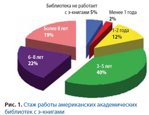 Опрос охватил все существенные проблемы, связанные с приобретением, использованием и оценкой библиотекарями опыта работы с электронными книгами. Причём стаж этой работы у 41% респондентов составляет более семи лет (ранее 2006 г.), и только 5% всё ещё не работают с электронными книгами (рис. 1).