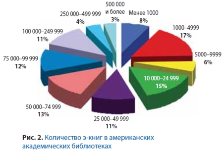 Вместе с тем, когда мы оценим, каким количеством э-книг (не путать с электронными ресурсами вообще) располагают американские библиотеки, мы разочаруемся. 25% университетских библиотек имеют доступ к менее чем 5000 книг. И этот показатель соответствует числу библиотек, расходы которых не превышают 5% бюджета. 44% имеют доступ к более чем 50 тыс. э-книг (рис. 2). Здесь, разумеется, важна величина библиотеки. Более трети крупных библиотек (36%) с бюджетом более 1 млн долларов имеют доступ к 100 тыс. книг и более (со средним медианным значением 190 тыс.). Важно отметить и скорость, с какой меняются эти данные: если в 2010 г. среднее значение по всем академическим библиотекам составляло 33 830 книг, то в 2012 г. – уже 91 900, поднявшись в три раза. Эти цифры значительно опережают аналогичные российские, в то же время по отношению к объёму англоязычного рынка они не так высоки[6]. И этому есть объяснение в моделях приобретения книг.