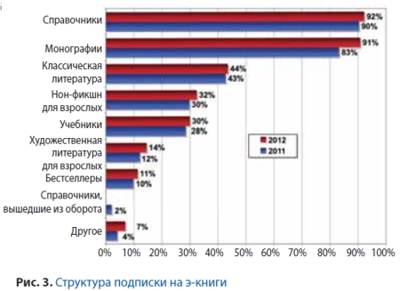 Наибольшее расхождение с российской практикой, с нашей точки зрения, имеет структура подписки университетских библиотек на э-книги. Среди основных категорий контента учебники занимают лишь пятую по популярности строку (30%), уступая справочной литературе (92%), монографиям (91%), классической литературе (44%) и даже нон-фикшн (32%) – (рис. 3). Это говорит об интенсивной научной университетской жизни и деятельности библиотек и, в свою очередь, бросает свет на нездоровье российской ситуации, при которой справочная и классическая литература целиком уходит в пиратский Интернет, монографии оказываются в недоступной зоне сиротской литературы, и практически весь легальный рынок концентрируется вокруг учебников.