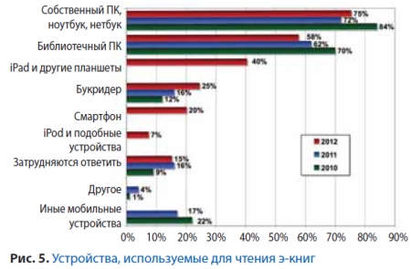 9. В публичных библиотеках соотношение полностью противоположно: 90% пользуются ридерами, 66% – планшетами, лишь 33% – собственными ноутбуками и всего 2% – библиотечными компьютерами. См. исследование Ebook Usage in Public Library – 2012 // Library Journal, 2012. – Р.108.