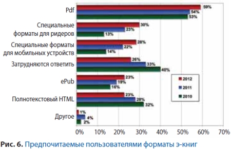 Соответственно, в академических библиотеках большая часть литературы представлена в формате pdf (59%), лишь 23% – в ePub или HTML (рис. 6). 85% литературы доступны для чтения онлайн, только 15% можно загружать в виде файлов. Технические возможности библиотек характеризуются возможностью отслеживать и контролировать статистику обращений – половина респондентов отмечают, что имеют такую возможность, 46% признаются, что не всегда. Средний показатель обращения к э-книгам за короткий срок вырос в четыре раза – с 6800 в 2010 г. до 24 700 в 2011 г. В университетских библиотеках в 2011 г. этот показатель достиг 35 800 обращений, а в крупных библиотеках – 61 900. Есть что подсчитать и над чем задуматься российским библиотекам.