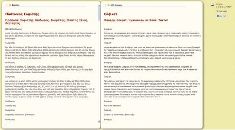 Электронная библиотека «Диглосса» (diglossa.ru) не ставит перед собой каких-либо научных, академических целей. Она предназначена для помощи тем, кто читает классические тексты, постоянно заглядывая в источник. «Диглосса» – библиотека для тех, кто читает медленно, почти по слогам. И даже просто по слогам: вряд ли можно читать Платона и Аристотеля в оригинале быстрее. Вдобавок, это традиция. Именно так и читались тексты во всех средневековых университетах, византийских школах, от Пифагора и до распространения книгопечатания. Идея «Диглоссы» родилась на семинаре А.В. Ахутина (см. bibler.ru), где тексты Платона и Канта читались хотя и по-русски, но с постоянным заглядыванием в источник, по паре абзацев текста за занятие.