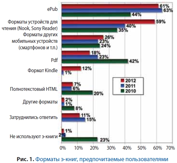 61%, т.е. почти две трети, желают работать с epub, и вообще, с форматами, адаптированными под мобильные электронные устройства (планшеты и ридеры). Только 18% предпочитают pdf, и это существенное снижение (42% в 2010 г.). Показательно, что неопределившихся всего 12%. Напомним, среди академических библиотек базовым форматом остаётся pdf.