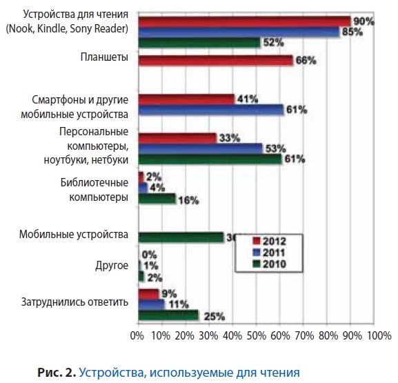 Что касается выбора устройств, то 90% пользователей для чтения электронных книг в библиотеках используют ридеры (для американского рынка это Kindle, Nook), 66% – планшеты (iPad и Kindle Fire), 41% – смартфоны, 33% – собственные ноутбуки и только 2% пользуются для чтения э-книг библиотечными компьютерами (рис. 2).
