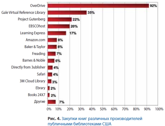 Здесь практически не встречается случаев, когда бы библиотеки работали с издательствами напрямую. На первом месте оказывается сервис OverDrive с 92%, – ресурс с наибольшими возможностями загрузки книг в мобильные устройства. На втором месте с большим отставанием – Gale Virtual Reference Library с 35%. Третий по популярности – ресурс открытого доступа к художественной классике Project Gutenberg (22%) и, наконец, EBSCO (с Netlibrary) – 20%. Основными критериями для выбора вендора являются совокупность критериев «справедливой цены» (100%), качества ассортимента (99%) и поддержки устройств (98%). К качеству сервиса относится удобство пользования и администрирования платформы (98%), одновременный выход печатных и электронных версий (79%), интерфейс с встроенным собственным дизайном библиотеки (79%), сервисы обучения персонала (76%), перенос MARC-записей в OPAC (Online Public Access Catalog) (66%). Для американских библиотек также важно присутствие на рынке консорциумных предложений, позволяющих оптимизировать затраты на электронные ресурсы. Такими формами закупки пользуются 69% библиотек. На российском рынке, как известно, такая практика не распространена.