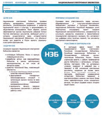 С точки зрения организации НЭБ формируется как библиотечный комплекс, состоящий из распределённого фонда электронных документов и распределённого каталога, объединённых общей архитектурой, протоколами и стандартами. Распределённая информационная система ресурса включает депозитарный и пользовательский фонды, каталог электронных документов, пользовательский интерфейс и комплекс аппаратно-программных средств, поддерживающих стабильное функционирование системы и дающих возможность оперативного пополнения, регистрации, долговременного хранения фондов НЭБ, многоаспектного поиска и распределённого многопользовательского сетевого доступа к её ресурсам. Интерфейс системы представлен на рисунке. Адрес ресурса в Интернете – www.rusneb.ru.