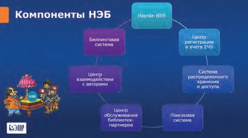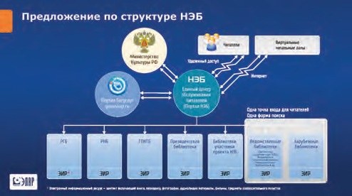 Основной принцип, который мы закладываем в концепцию, следующий: есть головные участники НЭБ, которые практически являются основными источниками её комплектования. Ресурсы, которые уже созданы библиотеками, будут в них оставаться, но эти библиотеки будут дорабатывать свои системы, чтобы обеспечить свободный доступ и к ресурсам, и к каталогам в рамках единого портала. Поэтому нами предлагается рассматривать НЭБ как единый портал, который бы обеспечивал единую точку доступа для библиотек, читателей и внешних сервисов, таких, как портал госуслуг и сайт Минкультуры России. Таким образом, он смог бы объединить, систематизировать задачи поиска литературы в любом источнике, межбиблиотечного обмена и пр.
