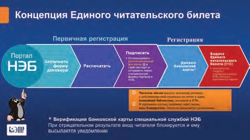 Есть поручение, которое требует создать систему, включающую в себя механизм выдачи и процедуру использования Единого читательского билета для библиотек федерального уровня. В рамках исследовательской группы электронных библиотек выделена подгруппа, которая специально занимается проблемами НЭБ. Для библиотек Минкультуры России эта система будет отрабатываться и вводиться уже сейчас, библиотекам, которые подчинены другим ведомствам, региональным библиотекам, мы будем предлагать присоединиться к нашей программе.