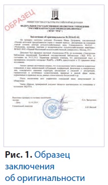 Основной целью проекта «Антиплагиат.РГБ» является повышение качества российского образования и науки путём мотивации авторов к самостоятельному написанию научных работ, исключая создание текстов путём компиляции материалов по заданной тематике, найденных в различных источниках. В результате проверки текстового документа экспертом РГБ составляется заключение, которое обязательно содержит фамилию, имя и отчество автора и данные с титульного листа проверяемого документа, данные об актуальности коллекции ЭБД РГБ, результат первичной проверки системой «Антиплагиат.РГБ», перечень источников заимствования с указанием процента совпадения покаждому из них, а также подробное описание характера совпадений, отнесённых экспертом к заимствованиям, с указанием разделов документа, где они встречаются [4]. Заключение об оригинальности является итогом проведённой независимой экспертизы, предоставляющим данные о совпадениях с ЭБД РГБ. Заключение обладает юридической силой, так как подписывается не только экспертом, но и руководителем РГБ и заверяется гербовой печатью (рис. 1). При этом необходимо подчеркнуть, что окончательное решение о значимости выявленных некорректных заимствований и оригинальности работы остаётся за диссертационным советом и Высшей аттестационной комиссией при Министерстве образования и науки Российской Федерации (ВАК при Минобрнауки России).